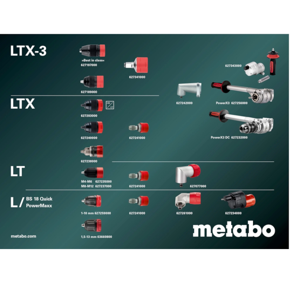 - Metabo quick system: quick exchange of chucks, bit holders, angle adapters and more for flexible work
